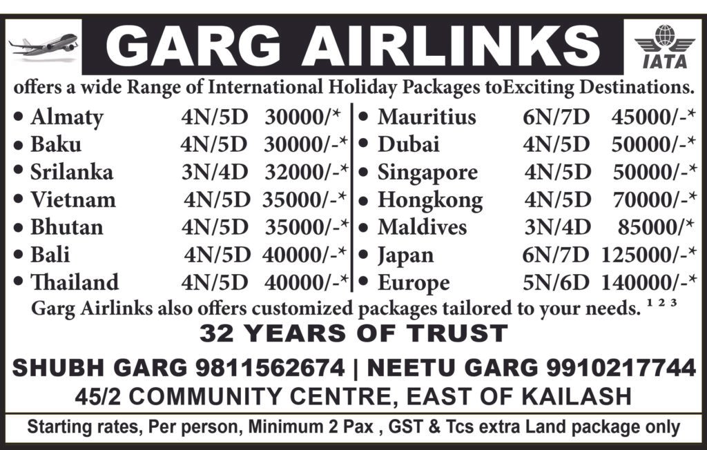 M/S GARG AIRLINK 45/2, COMMUNITY CENTER, EAST OF KAILASH, NEW DELHI PH : 9811562674